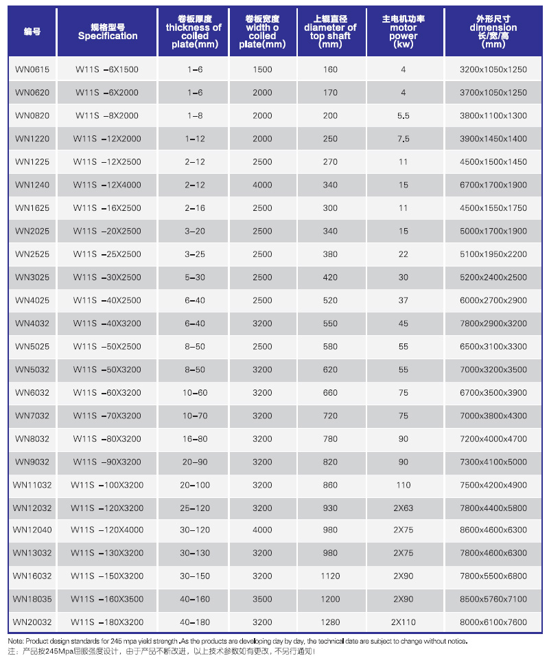 W11S系列上輥萬能式卷板機,引進日本技術生產,上輥可以垂直升降也可以水平方向移動。采用上輥直接加壓方式,可以控制板材剩余直邊的長度和形狀??梢跃碇贫喽位⌒?、方形、圓形、錐形、等工件。